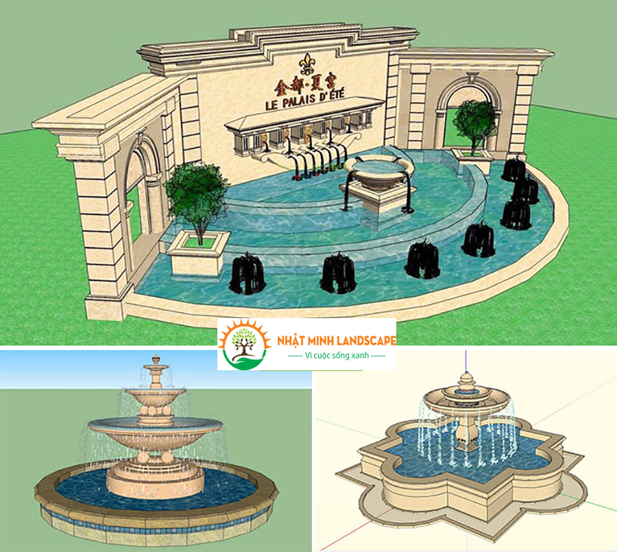 Từ các model đã giới thiệu ở trên, các kiến trúc sư bắt đầu thực hiện các bước phỏng không gian 3 chiều của đài phun nước. Mục đích của các thiết kế là để chủ đầu tư thấy trước hình dáng và cấu trúc của sản phẩm trước khi đưa vào thi công thực tế.
