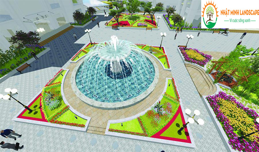 Tại Nhật Minh Lanscape, chúng tôi thực hiện công việc thiết kế với một diện tích rộng hơn. Khi đó, đài phun nước sẽ được nhìn thấy toàn cảnh trong không gian của công trình để xem xét mức độ phù hợp. Đồng thời, chúng tôi còn thực hiện thiết kế đi kèm với một số tiểu cảnh xung quanh để tổng thể dự án đẹp mắt và ấn tượng hơn.